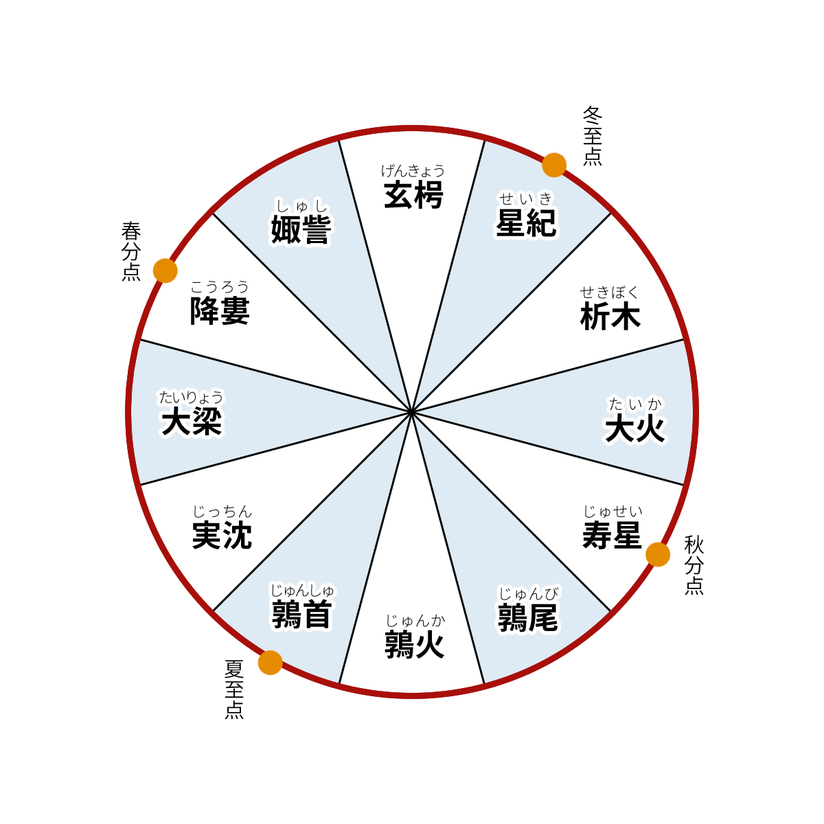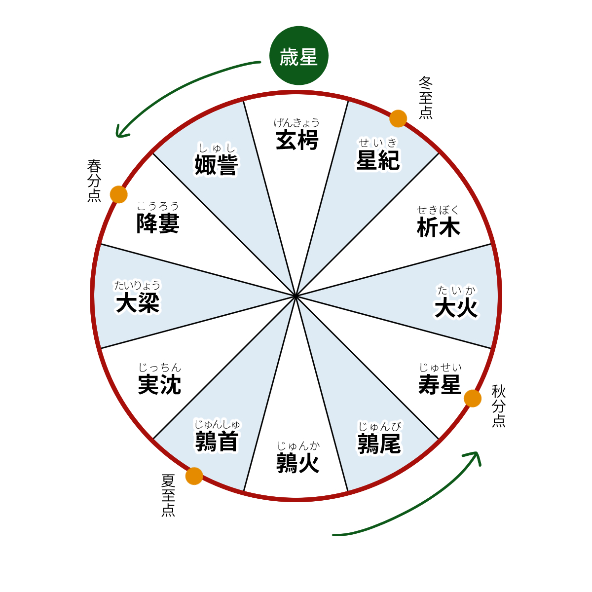 冬至点が中心にくるエリアを「星紀」として、以下木星が黄道上を進む方向(冬至点から春分点方向、天頂から見ると反時計回り)に「玄キョウ」「娵訾」「降婁」「大梁」「実沈」「鶉首」「鶉火」「鶉尾」「寿星」「大火」「析木」と呼ぶ。