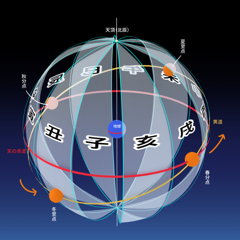 回転方向を合わせるために非実在天体を作り出すとか古代中国ダイナミックすぎる…と思った自由研究でした。頑張ったところは天球を半透明にするところと漢字を変換するところです。