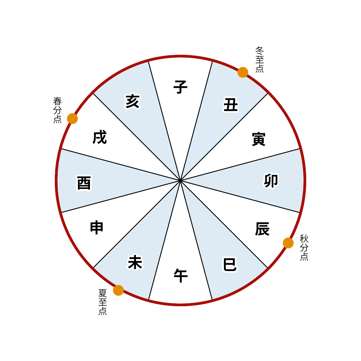 現代でもお馴染みの十二支の皆さんを、「丑」の中心に冬至点が来るように、以下時計回りに配置している。